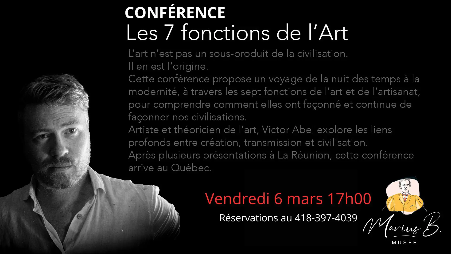 Une occasion d’en apprendre davantage sur les 7 fonctions de l'Art grâce à une conférence passionnante de l'artiste beauceron d'origine. Billets : 10 $ Réservations: 418-397-4039